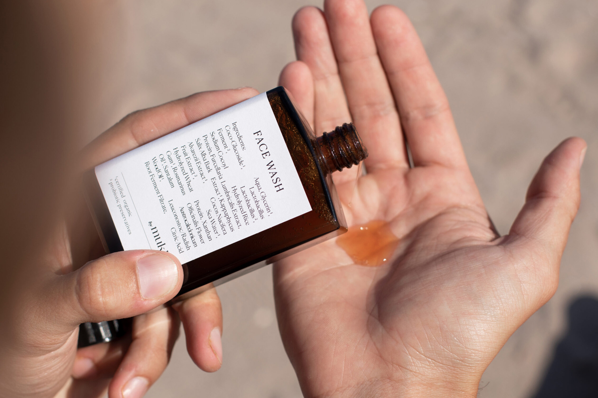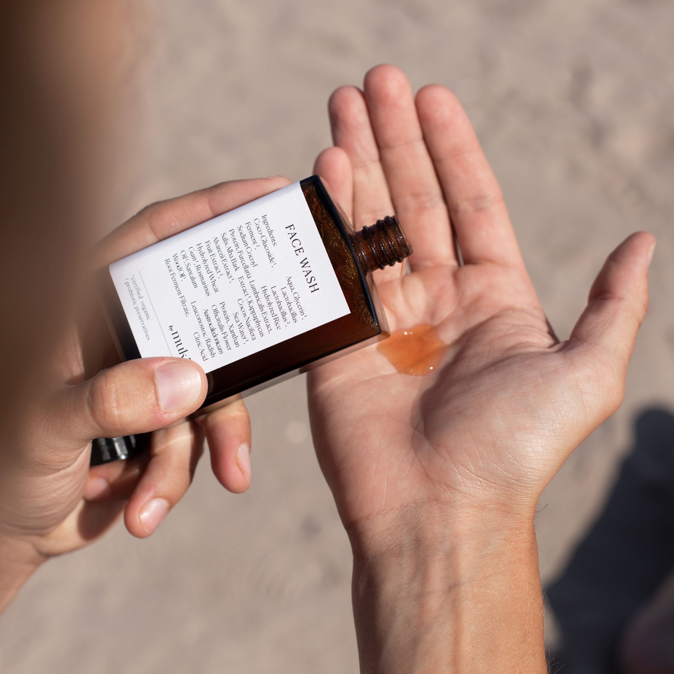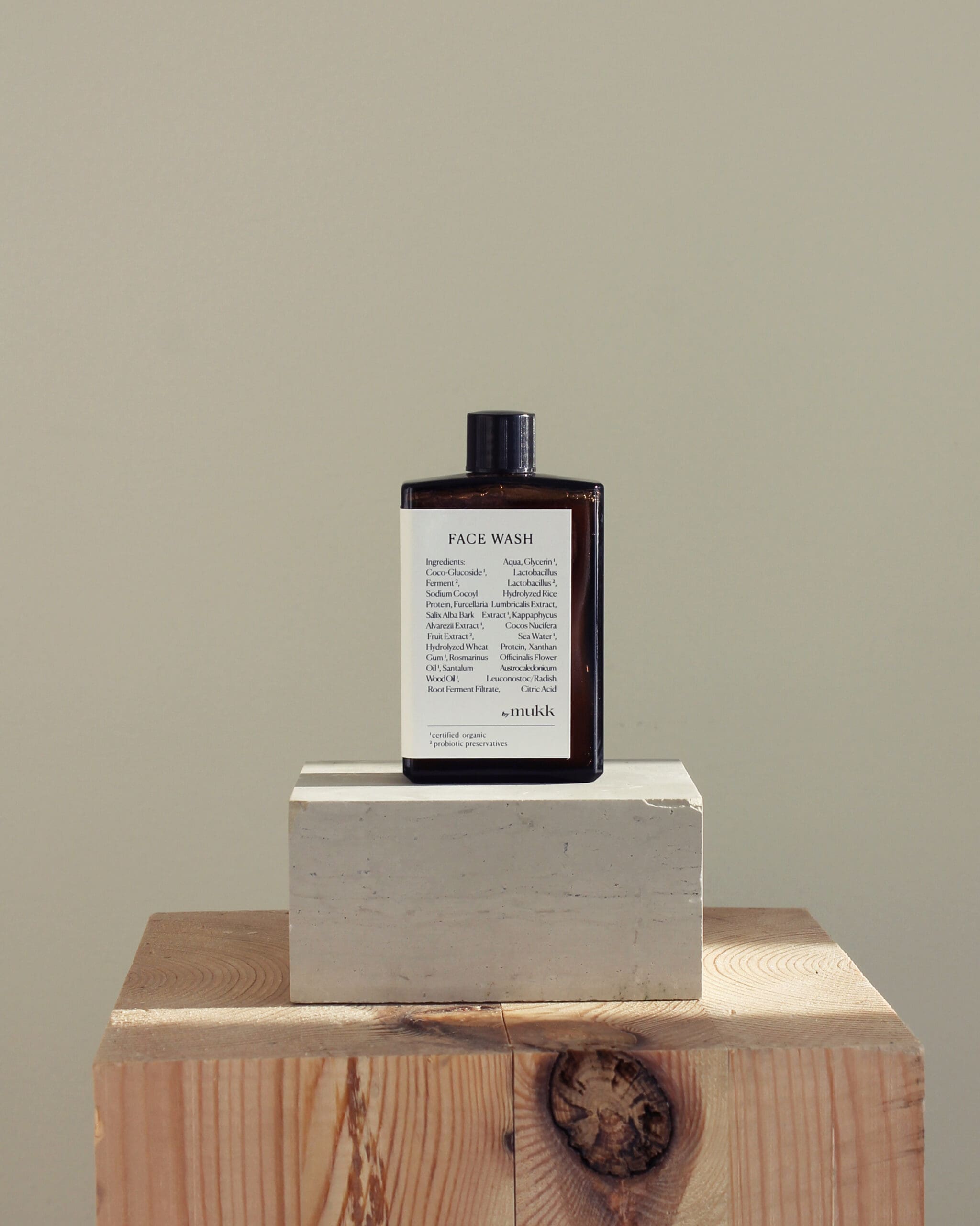 by mukk Face Wash is a seawater and algae extract infused gel-cleanser for a clarified and hydrated skin result. Cleanser preserves hydration and regulates the skin’s metabolic system. Natural salicylic acid promotes cell renewal and antimicrobial activity, removing surface impurities without drying the skin. Natural rice protein gives the product rich foaming properties, without drying the skin. Preserved with probiotic technology.