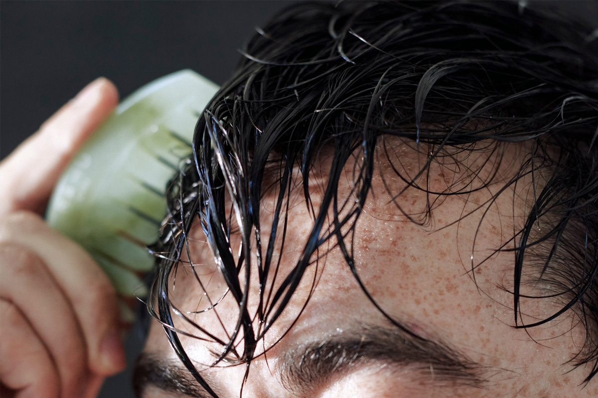 Apply scalp oil. Starting at the hairline, gently glide the comb along the scalp using light pressure, following the natural contour of the head. Work from front to back and from the sides toward the crown. Use slow, steady strokes to stimulate circulation and help distribute the product evenly across the scalp.