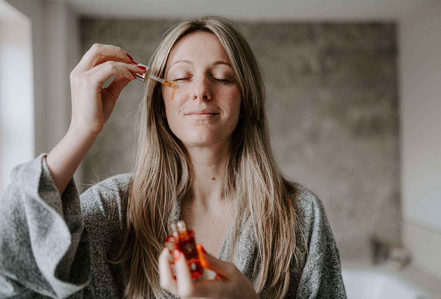 Place 2-3 drops of Pro Serum onto fingertips and smooth over the skin with a light tapping motion “like raindrops over the skin which will stimulate the skin and allow for deep absorption”.